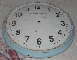 floor, lacks its hands and is covered in rust, a disturbing image for a clock